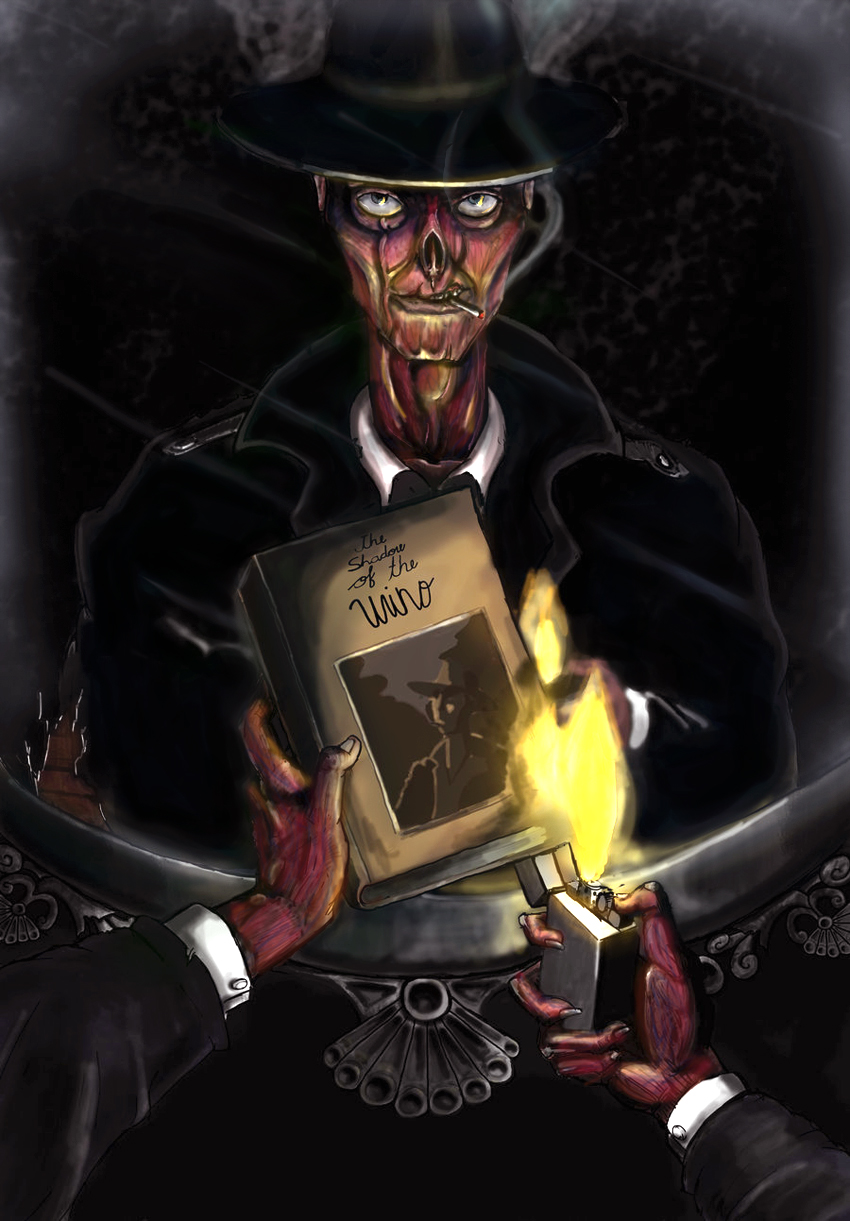Hopefully this helps to show the differences of using colors for shading compared to blacks and I want you to get better at what you're doing and sometimes I think examples say more than words so I'm sorry if you didn't like me messing with your pic and I'll take it down right away if you're not comfortable with it. All I did was add more pink and purples, added a brighter set of yellows, added whites to the mirror, and replaced the blacks in the face with reds and blues (which blend into darker purples at the deeper cracks). Colors tend to brighten a picture and so it made the pic less dull (blacks will darken and dull a scene rather then make it seem "nighttime") although I admit it might be TOO bright now haha and some contrast adjustment in ps might help that hmmm I'm so indecisive with everything heh. But anyways the picture itself that you drew is pretty great  I like the open skeletal nose and skinned face of this character and his little grimace holding the cigarette trailing smoke was a nice detail too. You also made an interesting pinup scene with the placement but setting it in a reflection. It's almost like it could be a book cover's art so you get a taste about what the theme and genera is...very noir but with a dash of horror or mystery. You ARE getting better from the last time I recall you did a digital painting, so keep it up and keep practicing those colors!