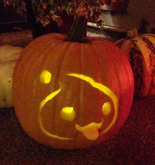 as usual i go to my mom's place to help out for halloween because a metric fuckton of kids show up in her neighborhood. i carved a poring pumpkin cuz it was cute  and was the only thing i could think of. i used an extra slice of pumpkin to make a tongue